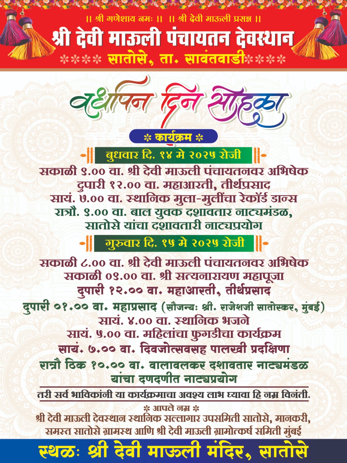 दिनांक १४ व १५ मे रोजी श्री देवी माऊली पंचायतनाचा वर्धापन दिन साजरा होत आहे. या सोहळ्या निमित्त विविध कार्यक्रमाची रूपरेषा आखण्यात आली आहे.