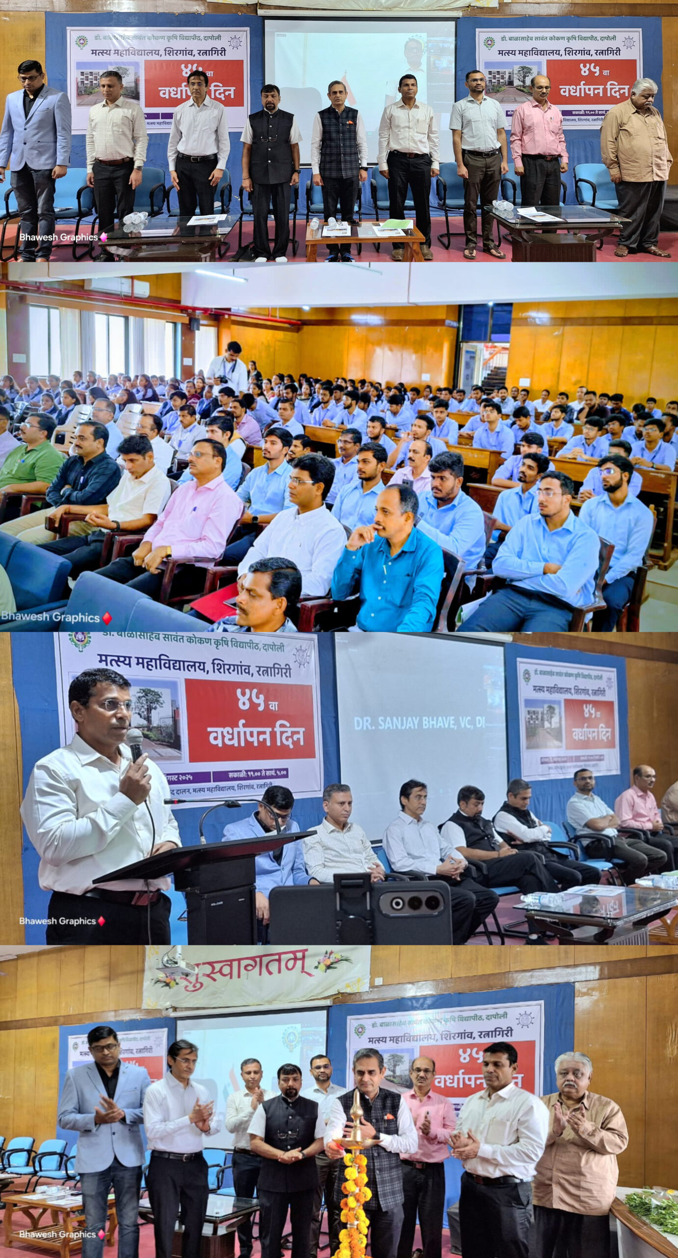 दुपारच्या सत्रात मत्स्य महाविद्यालयाचे अमेरिका, ऑस्ट्रेलिया, न्युझीलंड, इंग्लंड, जपान येथे शिक्षण, नोकरी निमित्त वास्तव्यास असलेल्या डॉ. श्रुतिका सावंत, डॉ. बानेश्वर सिंग, डॉ. रुचिरा सावंत, डॉ. अमित मोरे, श्री. अमोल भिंगार्डे, कु. सृष्टी सावंत, डॉ. दादासाहेब अकोलकर यांनी दृकश्राव्य माध्यमातून विद्यार्थ्यांशी संवाद साधून मार्गदर्शन केले. ४५ व्या स्थापना दिनाच्या निमित्ताने विद्यार्थ्यांनी डॉ. अनिरुद्ध अडसूळ यांचे मार्गदर्शनाखाली सांस्कृतिक कार्यक्रम सादर केले. त्यानंतर विविध स्पर्धांमध्ये व सांस्कृतिक कार्यक्रमात सहभागी झालेल्या विद्यार्थ्यांना प्रशस्तीपत्र देण्यात आले. या कार्यक्रमाचे सूत्रसंचालन डॉ. सुहास वासावे यांनी तर आभार डॉ. दबीर पठाण व डॉ. भावेश सावंत यांनी मानले.