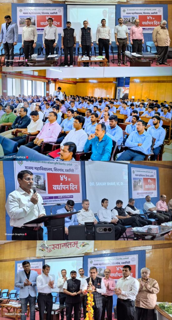 रत्नागिरी प्रतिनिधी: “मत्स्य महाविद्यालय, शिरगांव, रत्नागिरी आपला ४५ वा स्थापना दिन साजरा करत असताना महाविद्यालयाचे विद्यापीठातील व मत्स्य शास्त्रातील योगदान आदर्शवत आहे. गेल्या ४४ वर्षाच्या प्रदीर्घ कालावधीत महाविद्यालयाने शिक्षण, संशोधन व विस्तार शिक्षण या तिन्ही आघाड्यांवर आपला ठसा उमटवला असून या महाविद्यालयाचे माजी विद्यार्थी जगभर आपल्या कामाने महाविद्यालयाचे तसेच विद्यापीठाचे नाव झळकवत आहेत याचा सार्थ अभिमान कुलगुरू या नात्याने मला आहे” असे प्रतिपादन डॉ. बा. सा. कोकण कृषि विद्यापीठाचे सन्मा. कुलगुरू कर्नल कमांडंट डॉ. संजय भावे यांनी केले. मत्स्य महाविद्यालय शिरगांव रत्नागिरी च्या ४५ व्या स्थापना दिनाच्या उद्घाटन कार्यक्रमात ते बोलत होते. आज या कार्यक्रमाच्या निमित्ताने प्रमुख पाहुणे म्हणून आमंत्रित केलेले महाविद्यालयाचे पाच माजी विद्यार्थी हे मत्स्य शास्त्राच्या विविध क्षेत्रात आणि जगाच्या कानाकोपऱ्यात कार्यरत आहेत आणि हेच विद्यार्थी महाविद्यालयाचे खरे ‘सेलेब्रिटी’ आहेत असे गौरवोद्गार डॉ. भावे यांनी अध्यक्षीय भाषणात काढले. डॉ. बा. सा. कोकण कृषि विद्यापीठाचे सन्मा. कुलगुरू कर्नल कमांडंट डॉ. संजय भावे हे दूरदृष्य प्रणालीद्वारे कार्यक्रमात सहभागी झाले होते.