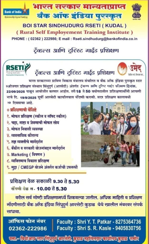 सावंतवाडी: भारत सरकारच्या ग्रामीण विकास मंत्रालय व बँक ऑफ इंडिया पुरस्कृत स्टार स्वयंरोजगार प्रशिक्षण संस्थान सिंधुदुर्ग (आरसेटी ) अंतर्गत ट्रॅव्हल्स आणि टुरिस्ट गाईड प्रशिक्षण दिनांक: २२ सप्टेंबर २०२५ रोजी पासून आयोजित करण्यात आले आहे.१८ ते ५० वयोगटातील प्रशिक्षणार्थी आपली नावे नोंदवू शकतात ही नोंदणी दिनांक १९ नोव्हेंबर २०२५ पूर्वी आरसेटी कार्यालयात नोंदणी करावी. सदर प्रशिक्षण कालावधी दहा दिवसाचा असेल या प्रशिक्षणाचे वैशिष्ट्ये खालील प्रमाणे आहेत.
