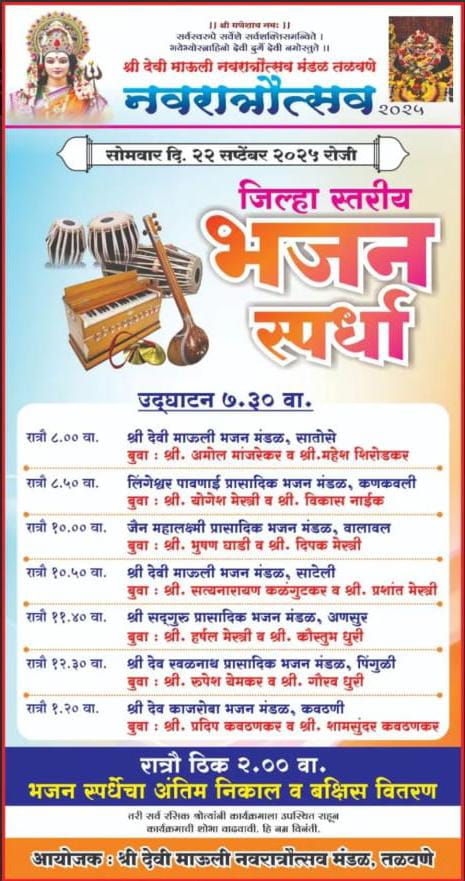 श्री देवी माऊली मंदिर तळवणे येथे नवरात्रोत्सवाचे औचित्य साधून भजन स्पर्धा आयोजित करण्यात आली आहे .श्री देवी माऊली मंदिरामध्ये सर्व मंडळींच्या एकमताने एकजुटीने अनेक प्रकारचे वेगवेगळे कार्यक्रम आयोजित केले जातात. त्यातील हा एक जिल्हास्तरीय भजन स्पर्धेचा कार्यक्रम होणार आहे. श्री देवी माऊलीच्या कृपाशीर्वादाने कार्यक्रमांची व्याप्ती वर्षानुवर्षे वाढतच असते.