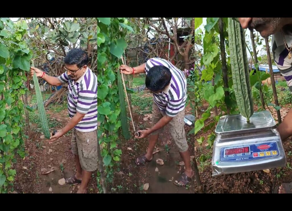 दोडामार्ग तालुक्यातील वझरे येथील नारायण उर्फ संतोष आत्माराम सिद्धये यांनी यावर्षी आपल्या बागेत ऑर्गानिक पद्धतीने गाईच्या ताकापासून खत बनवून त्यावर दोडका यावेल वर्गी भाजीचं उत्पन्न घेऊन तब्बल ३१ इंच लांबीचं आणि १ किलो २०० ग्राम वजनी दोडक्याची फळ घेतले.