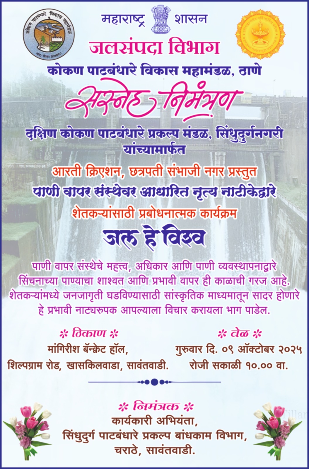 सावंतवाडी: कोकण पाटबंधारे विकास महामंडळ अंतर्गत दक्षिण कोकण पाटबंधारे प्रकल्प मंडळ यांच्यामार्फत गुरुवार ९ ऑक्टोबर रोजी सकाळी १० वाजता सावंतवाडीत शिल्पग्राम रोड येथील मांगिरीश बॅन्क्वेट हॉलमध्ये ‘जल हे विश्व’ या शेतकऱ्यांसाठी प्रबोधनात्मक कार्यक्रमाचे आयोजन करण्यात आले आहे.