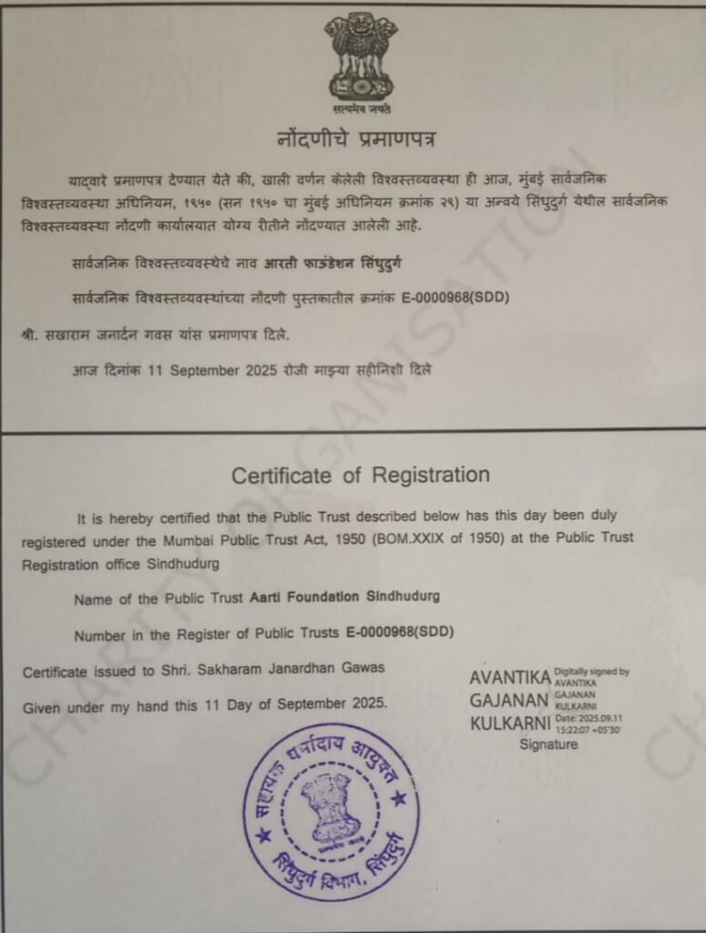 बांदा: आरती फाउंडेशन ट्रस्टला सिंधुदुर्ग जिल्ह्यात मान्यता मिळाली असून हि ट्रस्ट दिनांक ११ सप्टेंबर २०२५ रोजी उदयास आली आहे. सिंधुदुर्गातील सामाजिक ,शैक्षणिक ,सांस्कृतिक ,कला ,क्रीडा, कृषी ,आरोग्य ,पर्यटन असे सामाजिक उपक्रम राबवून बहुउद्देशीय कार्य करण्यासाठी आरती फाउंडेशन सिंधुदुर्ग (नोंदणी क्रमांक ई ००००९६८ सिंधुदुर्ग ) संस्था /ट्रस्ट स्थापन करण्यात आली आहे. समाजातील गरीब गरजू तसेच सर्व घटकांना सोबत घेऊन संस्था अविरतपणे सिंधुदुर्ग जिल्ह्यासाठी काम करणार आहे .