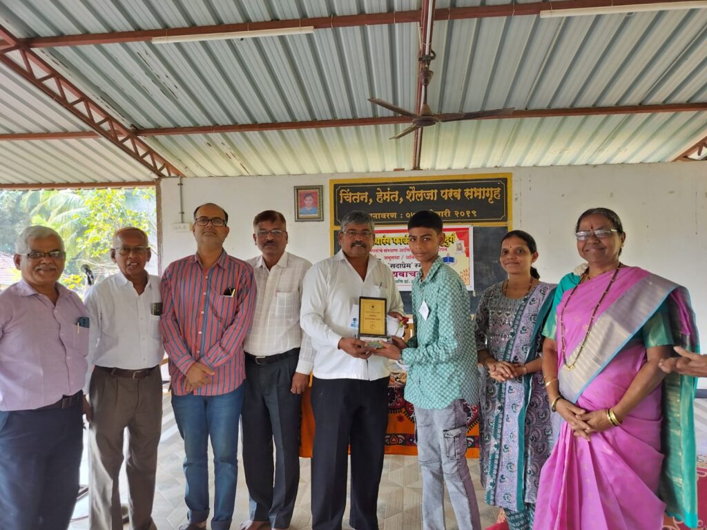 मळगाव येथे आयोजित जिल्हास्तरीय स्वरचित काव्य वाचन स्पर्धेतील विजेता नैतिक मोरजकर याला सन्मानित करताना मान्यवर.