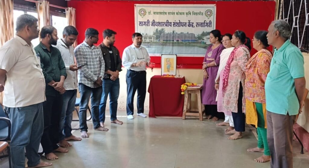 रत्नागिरी: डॉ. बाळासाहेब सावंत कोकण कृषि विद्यापीठ अंतर्गत झाडगाव, रत्नागिरी येथील सागरी जीवशास्त्रीय संशोधन केंद्र, रत्नागिरी येथे संशोधन केंद्र प्रमुख डॉ. केतन चौधरी यांच्या हस्ते भगवान बिरसा मुंडा यांच्या प्रतिमेस पुषहार अर्पण करून जयंती साजरी करण्यात आली. यावेळी उपस्थितांना डॉ. केतन चौधरी यांनी बिरसा मुंडा यांच्या कार्याची माहिती दिली. यावेळी यु.एन.डी.पी. प्रकल्पाच्या श्रीम. पियुषा शेलार- देसाई, श्री पंडीत, तसेच पिलेजिक सी-विड रिअर संस्थेचे श्री. निनाद जाधव आणि अविनाश जाधव सुद्धा उपस्थित होते. सागरी जीवशास्त्रीय संशोधन केंद्रातील अधिकारी प्रा. नरेंद्र चोगले व सचिन साटम, जीवशास्त्रज्ञ श्रीम. वर्षा सदावर्ते व अपूर्वा सावंत तसेच अन्य कर्मचारी उपस्थित होते. उपस्थितांनी प्रतिमेस पुष्प अर्पण करून अभिवादन केले.
