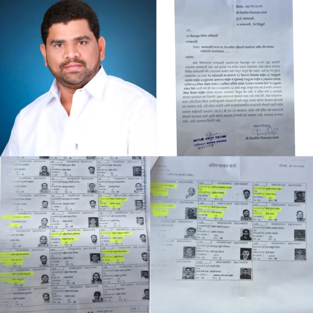 कणकवली: उबाठा चे माजी आमदार वैभव नाईक यांच्या कणकवली येथील निवासस्थानी राहत असल्याचे भासून दहा बोगस मतदारांची नाव नोंदणी करण्यात आली आहे. या मतदारांवर प्रभाग क्रमांक 15 मधील भाजपचे उमेदवार विश्वजीत विजयराव रासम यांनी हरकत नोंदवली आहे. माजी आमदार रहात असलेल्या घर क्रमांक 84 मध्ये या दहा मतदारांची नावे नोंदवलेली आहेत प्रत्यक्षातही काही लोक या ठिकाणी राहत नाही याचा अर्थ हे सर्व मतदार बोगस असल्याचा आरोप भाजपच्या उमेदवाराने केला आहे.
