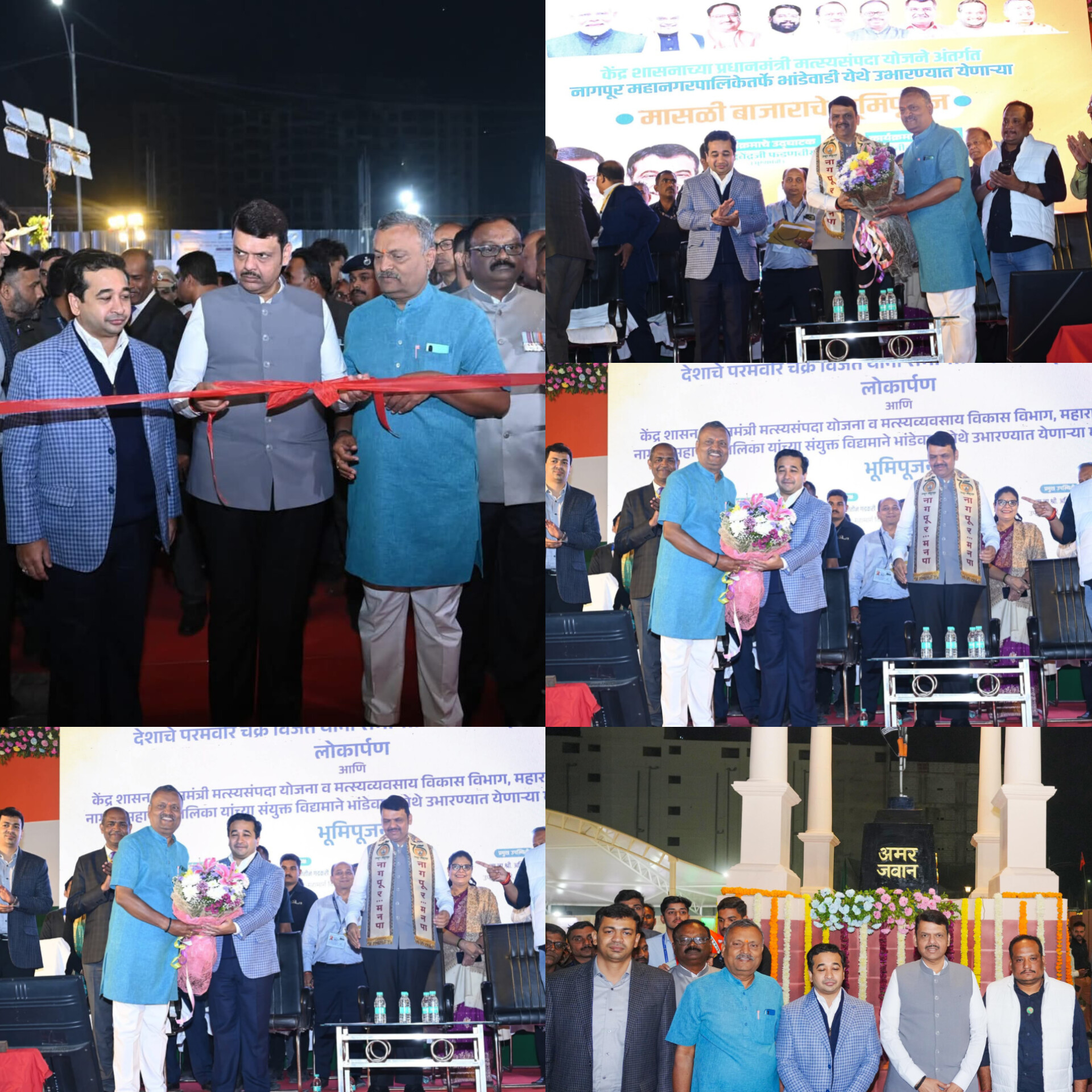 नागपूर: परमवीरचक्र विजेत्या सैनिकांना समर्पित नागपूर महानगरपालिकेच्या ‘वंदे मातरम् उद्याना’चे लोकार्पण व केंद्र शासन प्रधानमंत्री मत्स्यसंपदा योजना व मत्स्यव्यवसाय विभाग, महाराष्ट्र राज्य आणि नागपूर महानगरपालिका यांच्या संयुक्त विद्यमाने भांडेवाडी येथे उभारण्यात येणाऱ्या मासळी बाजाराचे भूमिपूजन मुख्यमंत्री देवेंद्रजी फडणवीस, मत्स्यव्यवसाय व बंदरे विकास मंत्री नितेशजी राणे यांच्या प्रमुख उपस्थितीत पार पडले.