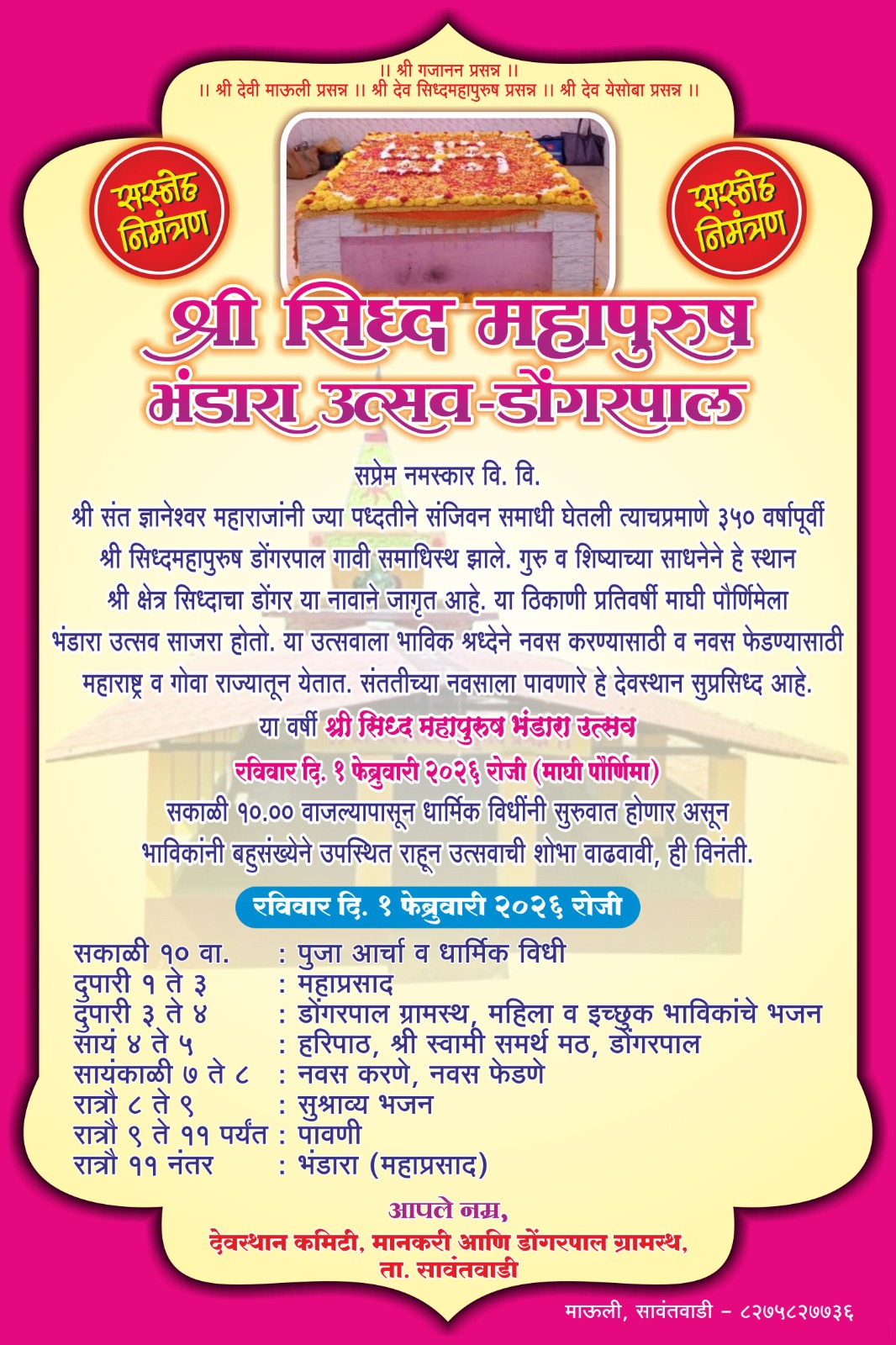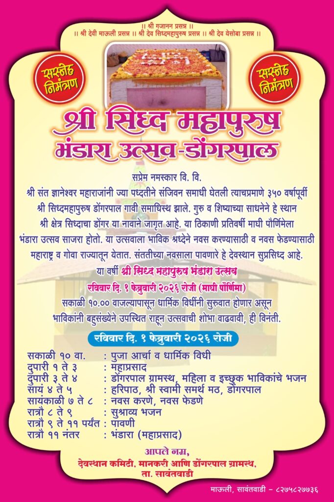 बांदा प्रतिनिधी: डोंगरपाल येथील श्री सिद्ध महापुरुष भंडारा उत्सव माघ पौर्णिमा रविवार दि.१ फेब्रुवारी रोजी साजरा होत आहे.यानिमित्ताने विविध धार्मिक कार्यक्रमांचे आयोजन करण्यात आले आहे.