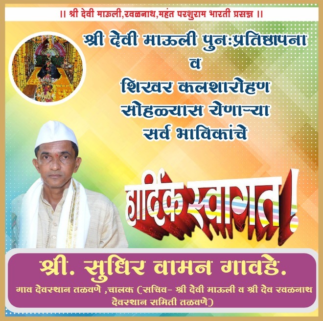 आताच शेअर करा दिनांक: १८/०४/२०२६ तळवणे प्रतिनिधी: शंकर गावडे Post navigation श्री देवी माऊली तळवणे पुन:प्रतिष्ठापना व कलशारोहण सोहळ्यास येणाऱ्या सर्व भाविकांचे हार्दिक अभिनंदन. 💐 शुभेच्छुक💐सौ . नेहा नारायण कांबळी (पंचायत समिती सदस्य, आरोंदा.) श्री देवी माऊली तळवणे पुन:प्रतिष्ठापना व कलशारोहण सोहळ्यास येणाऱ्या सर्व भाविकांचे हार्दिक अभिनंदन. 💐 शुभेच्छुक💐श्री . रवींद्र बाबुराव गावडे, मालक अध्यक्ष- श्री देवी माऊली व श्री देव रवळनाथ देवस्थान समिती तळवणे.)